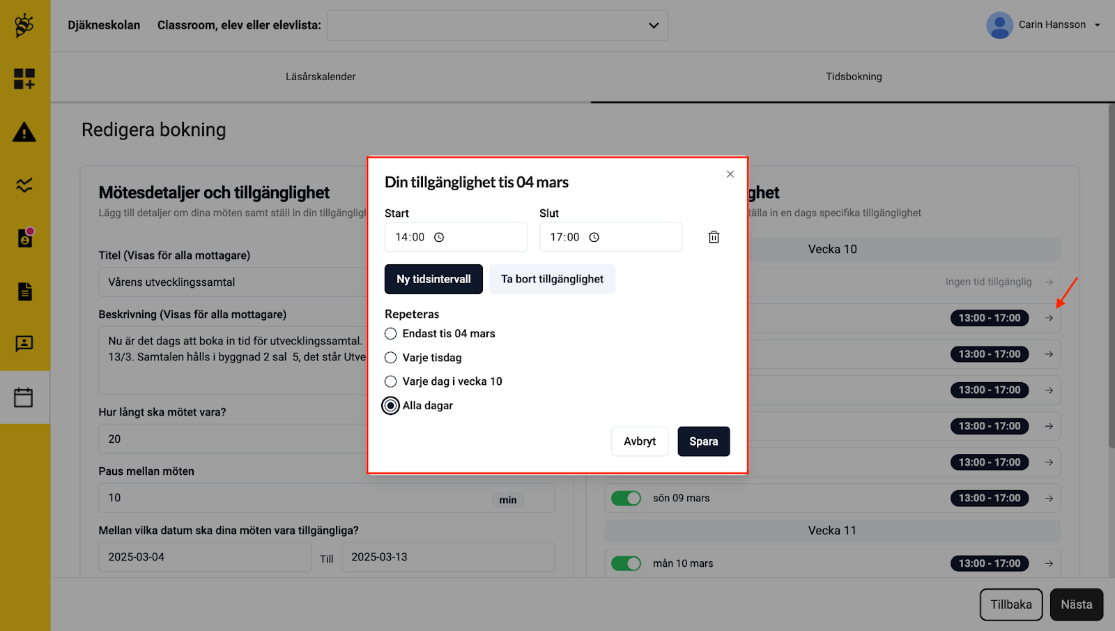 Du kan ställa in din tillgänglighet för de valda dagarna genom att klicka på en av dagarna eller utesluta en hel dag genom att klicka på , se nedan.