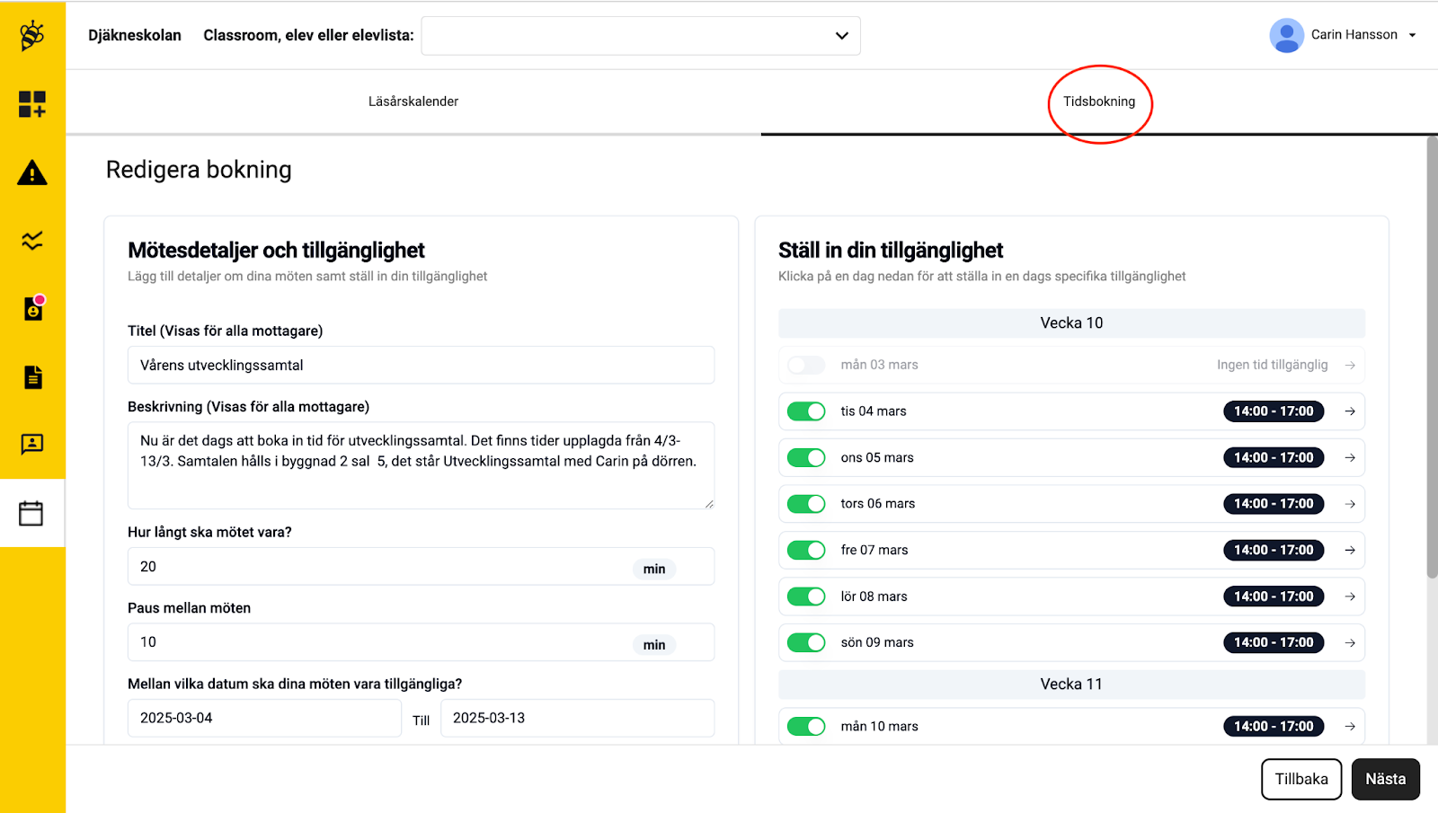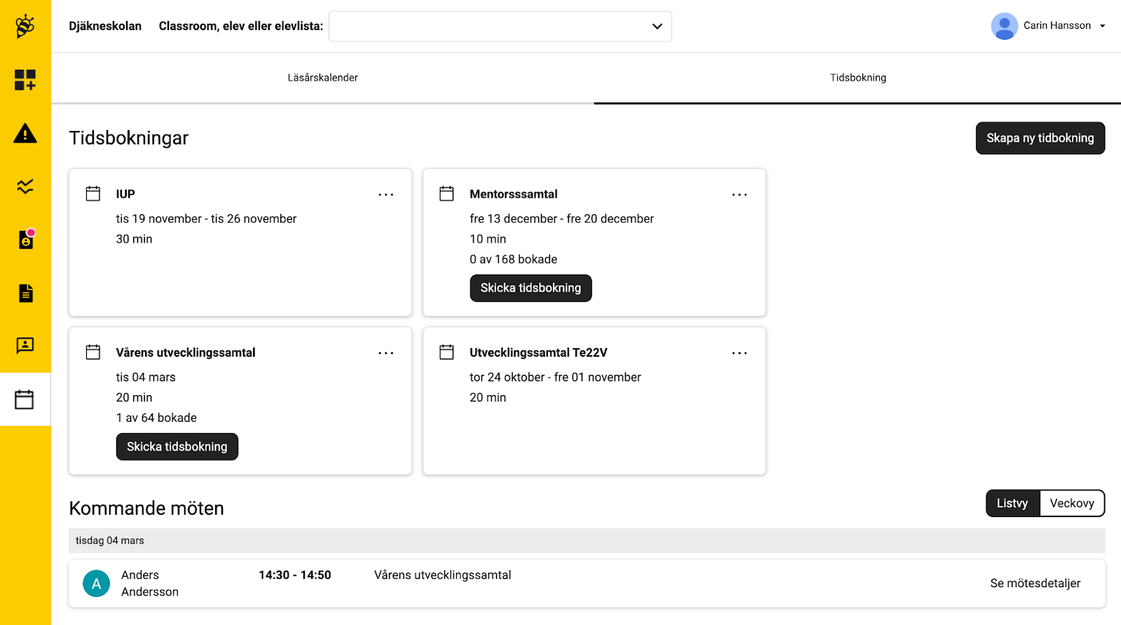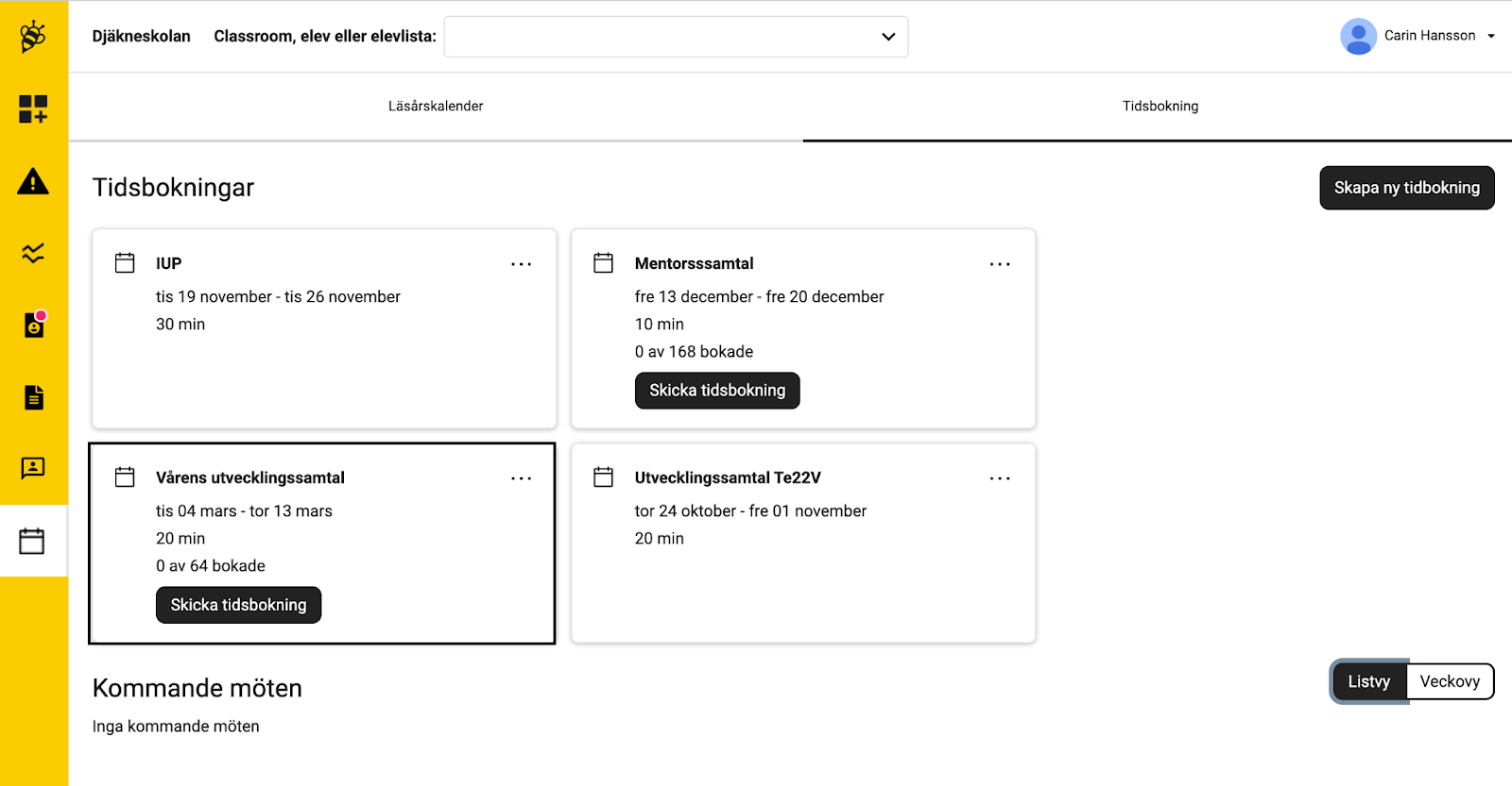 Funktionen Tidsbokning låter dig skapa serier för bokningsbara tider t.ex. inför utvecklingssamtal, mentorssamtal med mera. Funktionen nås via kalenderikonen i StudyBee Insights. Längst upp på sidan växlar man mellan Läsårskalender och Tidsbokning, se bild nedan.