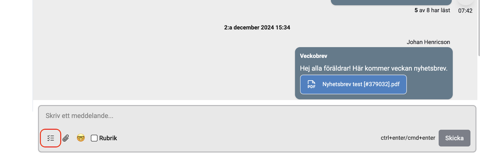 När du skapat dina bokningsbara tider kan du i nästa steg skicka inbjudan till dina elever eller deras vårdnadshavare, genom att på rutan för din serie klicka på Skicka tidbokning. Du kommer då till kommunikationsfliken (se artikeln om Kommunikation) och kan välja de mottagare som du vill bjuda in att boka en tid. Du kan där välja att skicka tidsbokning till en eller flera elever och/eller till deras vårdnadshavare och kan skriva en text eller bifoga fler filer till din mötesserie.
