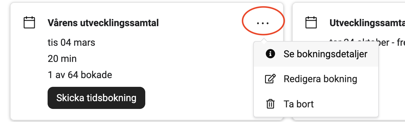 Klicka på de tre prickarna för att, se bokningsdetaljer, redigera bokning eller ta bort den.