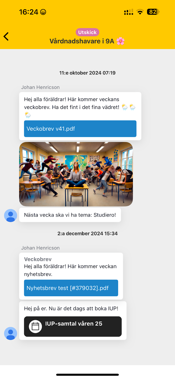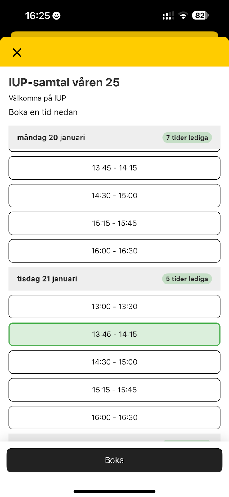 När en tidsbokning skickas till elever och/eller vårdnadshavare går det ut en notis som leder dem direkt till tidsbokningen, den nås också under under kommunikation. Den inbjudne klickar på den svarta bilagan och får välja en av de tillgängliga tiderna. Endast en tid per elev går att boka, även om det finns flera vårdnadshavare.